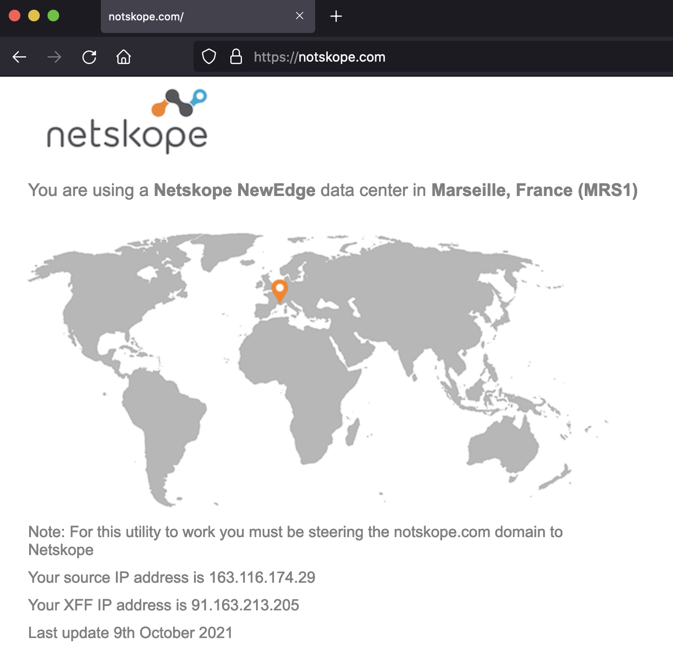 Step 11 Try [https://notskope.com] to verify which Netskope DC you are connected to. It may not be the same as in the screenshot below, but it must point to somewhere close to you.