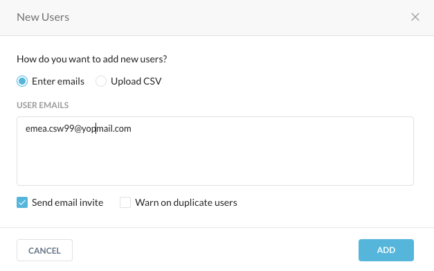 Step 4 Enter the following emea.csw[x]@yopmail.com email address you have been assigned in your workshop confirmation and click the Add button.