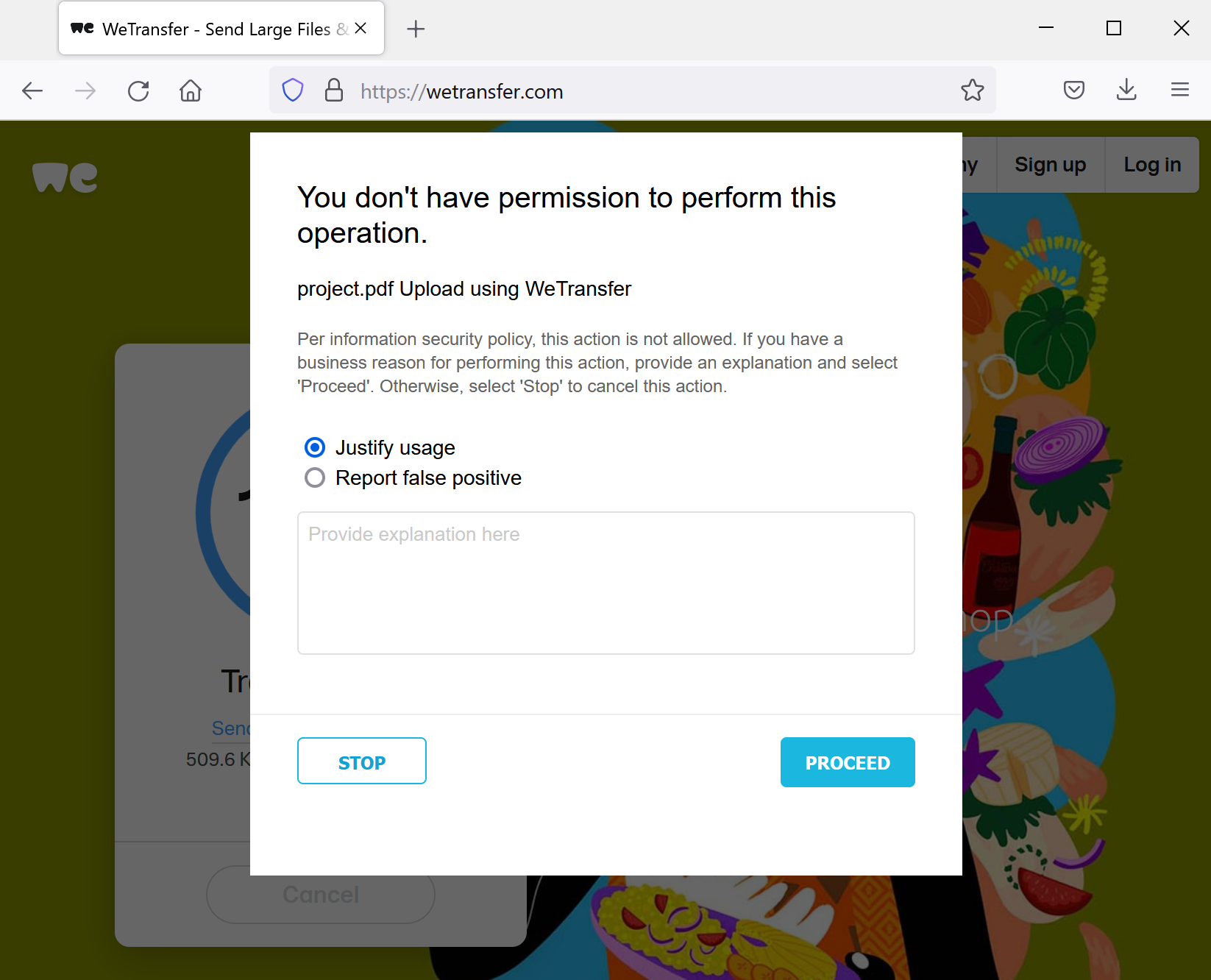 Step 4 Look for a WeTransfer entry for your user regarding your activity. Expand by using the spyglass icon to see what details are available. Find out which policy triggered here and have a closer look at what is configured in that policy.